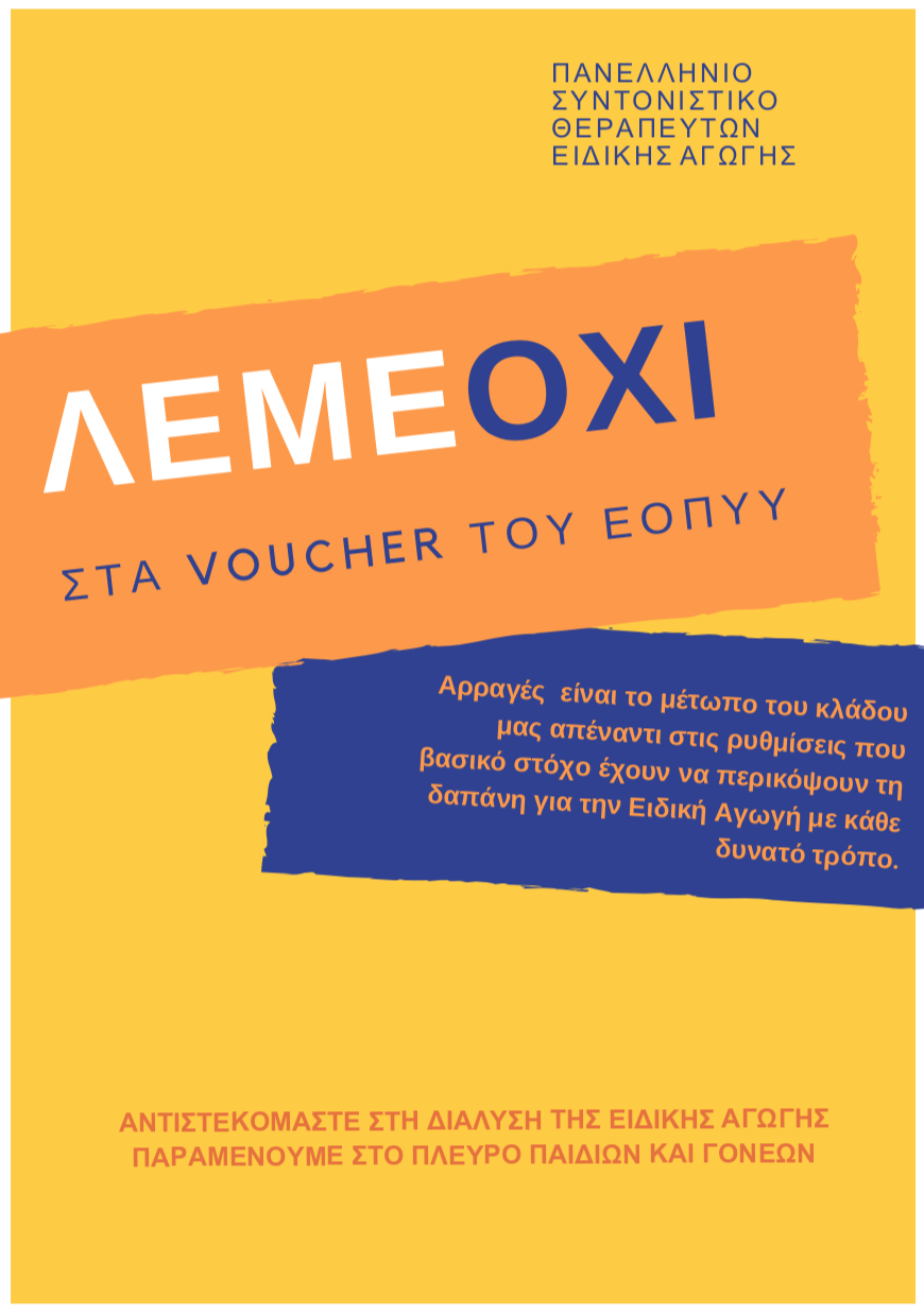 Συνάδελφοι, ο κλάδος μας διέρχεται τις πιο κρίσιμες ημέρες του. Θα χρησιμοποιήσουν κάθε διαθέσιμο μέσο για να μας απειλήσουν, να μας τρομοκρατήσουν, να μας φέρουν αντιμέτωπους με τους γονείς και τα παιδιά. Είμαστε προετοιμασμένοι και θα λάβουν τις απαντήσεις τους. Το πιο κρίσιμο στοιχείο όμως, για να εξασφαλίσουμε την επιβίωσή μας είναι η μη αποδοχή από τον καθένα και την καθεμία από εμάς ξεχωριστά των voucher. Mην ξεχνάτε, ουδέποτε είχαμε την οποιαδήποτε άμεση σχέση με τον ΕΟΠΥΥ και ούτε πρόκειται να την αποκτήσουμε!